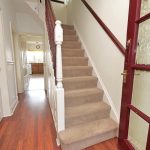 Stairs leading to first floor landing. Understairs storage. Wood effect flooring. Central heating radiator.