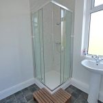 Well-appointed two-piece white suite comprising shower enclosure housing thermostatic shower and pedestal hand wash basin. Central heating radiator. UPVC sealed unit double glazing.