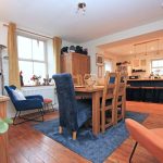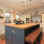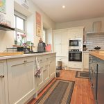 15'4" x 12'3" Superbly appointed with a high quality range of individually crafted units by 'Dovetail' Kitchen installers - having solid wood fronts finished in Slipper Satin with contrasting quartz worktop surfaces including matching up-stands. Matching store cupboards and a matching utility cupboard with plumbing for an automatic washing machine and provision to fit a dryer. Built-in one and a half bowl stainless steel sink with a pillar tap and a worktop drainer. Built in split level Caple oven in stainless steel finish with a matching Caple microwave oven above. Fitted Neff five ring gas hob in stainless steel finish having a white Metro tiled surround and a Caple extractor hood above in a stainless steel finish canopy. Newly installed Kenwood dishwasher. Built-in Bosch fridge and freezer. Wine rack. Individually crafted solid wood island unit finished in Hague blue with a solid oak worktop and also providing a breakfast table/bar. Varnished boarded flooring. Sealed unit double glazing to two sides. Pleasant aspects and views. Central heating radiator. Recessed LED ceiling spotlights and pendant lights. Sealed unit double glazed external door to the attractive side patio garden.