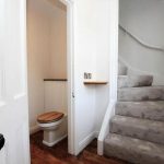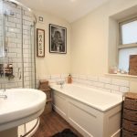 With a two piece white suite comprising a corner hand wash basin and a back-to-wall WC. Granite worktop. Varnished boarded flooring. Recessed LED ceiling spotlight.