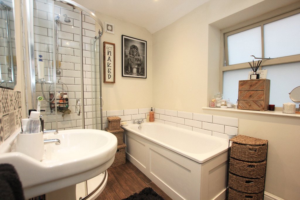 Superbly appointed with a quality contemporary white suite comprising a panelled enamelled bath, a pedestal wash basin, a back-to-wall WC and a shower cubicle having a thermostatic shower. Contrasting partial Metro white wall tiling. Sealed unit double glazing. Ladder radiator in chrome finish. Recessed LED ceiling spotlights. Extractor fan.