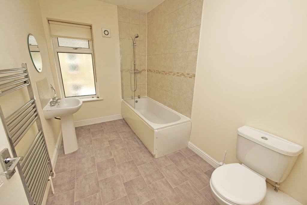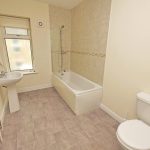 Well equipped with a three piece white suite comprising low suite WC, pedestal hand wash basin and a panelled bath with chrome mixer shower over. Partial ceramic wall tiling. Chrome towel radiator. Sealed unit double glazed window. Extractor fan.