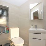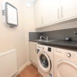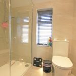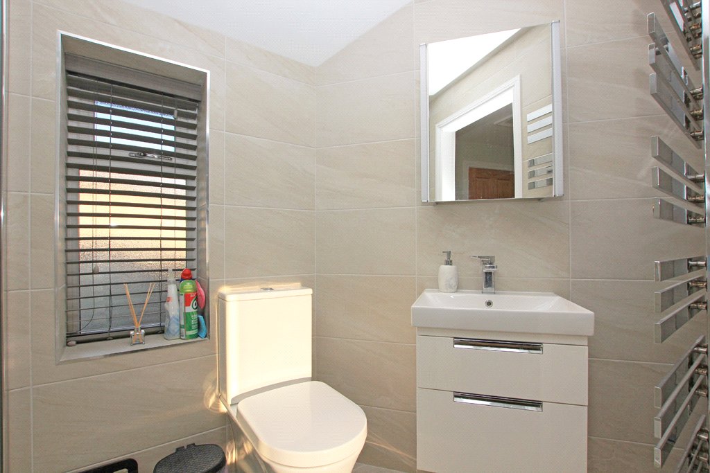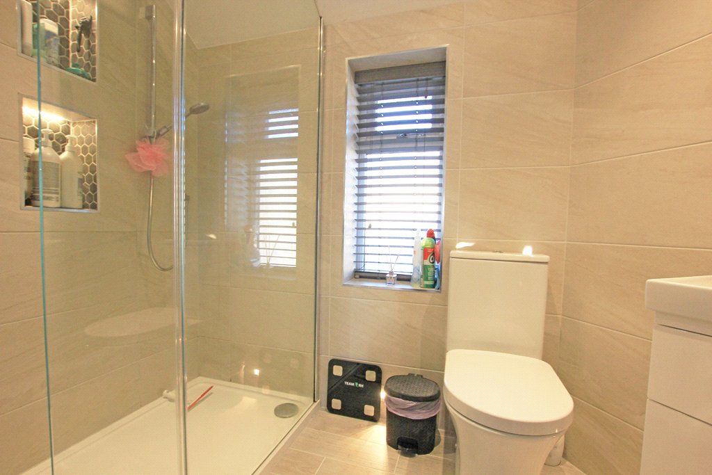 With a quality contemporary three piece white suite comprising a low suite WC, a hand wash basin and a white gloss fronted vanity cabinet unit beneath and also a large shower cubicle having a glass screen, a hand held shower and overhead drench shower. Contrasting wall tiling and tiled flooring. Fitted mirror. UPVC sealed unit double glazing. Ladder central heating radiator in chrome finish. Extractor fan. Recessed ceiling spotlights.