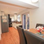 23'5" x 7'5" superbly appointed with a range of stylish modern fitted white fronted wall and base units incorporating contrasting solid oak worktop surfaces having tiled surrounds. Belfast recessed sink incorporating chrome mixer tap over. Rangemaster electric cooker incorporating five ring gas hob having matching extractor hood above. Integrated dishwasher. Concealed Worcester gas combination boiler. Under stairs storage. Karndean oak style flooring. Recessed ceiling spotlights. Central heating radiator. Three UPVC sealed unit double glazed windows. UPVC sealed unit double glazed patio doors. Open through to: