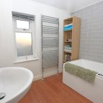 With a quality contemporary three piece white suite comprising a low suite WC, a pedestal hand wash basin, there is also a built-in bath having a folding glass shower screen and a shower over. Contrasting Metro tiling to the shower. Ladder central heating radiator in a chrome finish. Wood effect Karndean flooring. UPVC sealed unit double glazing. Recessed ceiling spotlights. Extractor fan.