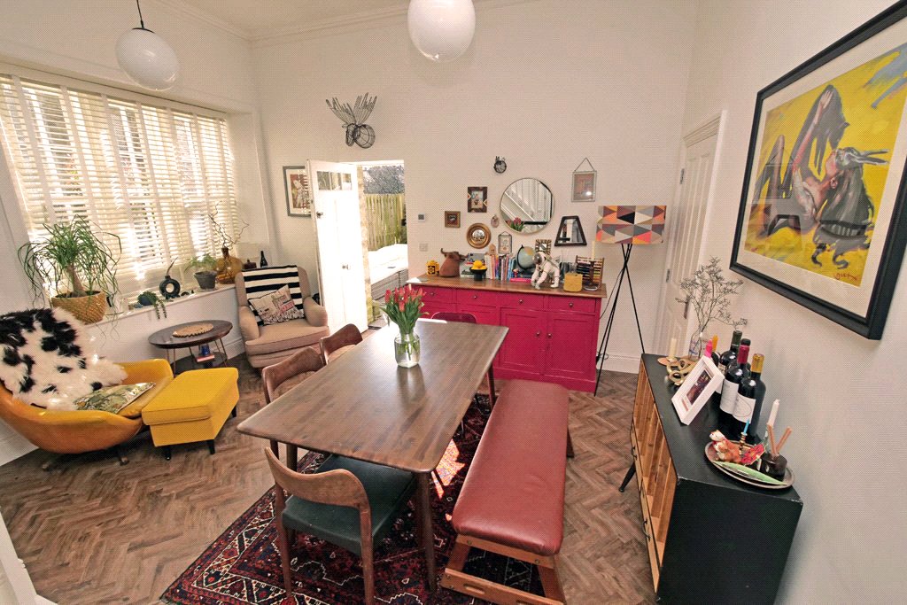 19’01” X 13’09” With substantial timber entrance door. Sealed unit double glazed sash windows. Built in cupboard. Staircase leading to first floor landing. Zoned under floor heating. Karndean parquet flooring. Entrance door leading to enclosed rear garden. Open to: