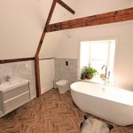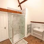 Well-appointed four-piece white suite compromising, free standing bath, shower enclosure housing thermotic shower, hand wash basin set on vanity cabinet and low suite w/c. Ladder towel radiator in chrome finish. Karndean parquet wood flooring. Sealed unit double glazing. Vaulted ceiling. Exposed beams. Built in wardrobe. Recessed ceiling spotlights. Extractor fan.
