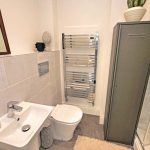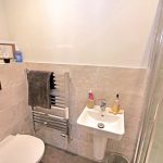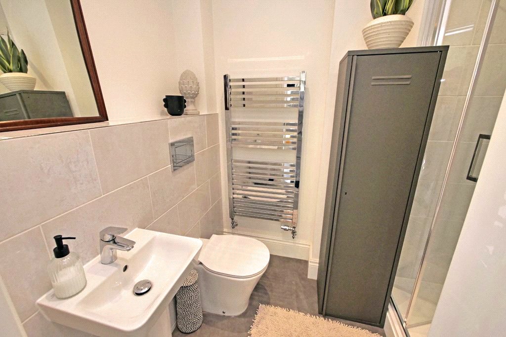 Well-appointed three-piece white suite compromising walk in shower enclosure housing thermostatic shower, floating hand wash basin and low suite w/c. Partial ceramic wall tiles. Ladder towel radiator in chrome finish. Recessed ceiling spotlights. Extractor fan.