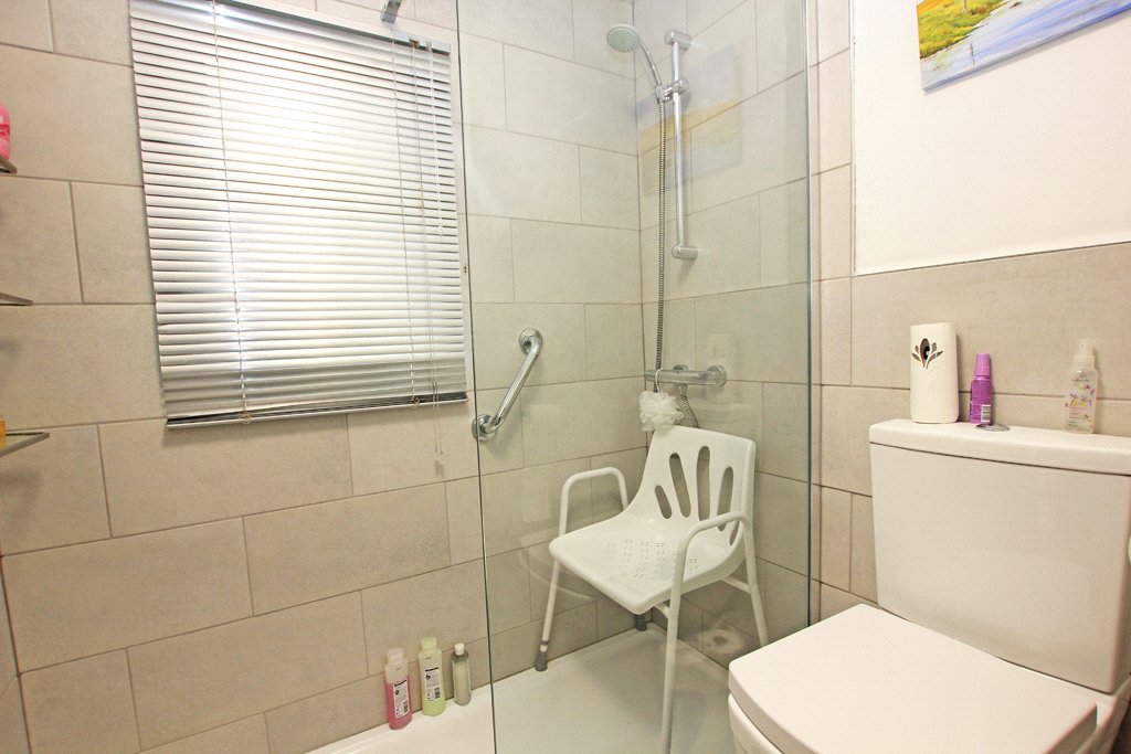 Vanity wash basin. Low suite w/c. Large walk in shower cubicle with a chrome thermostatic shower. Chrome heated towel rail. Extractor fan. Partial wall tiling. Sealed unit UPVC double glazed window.