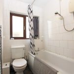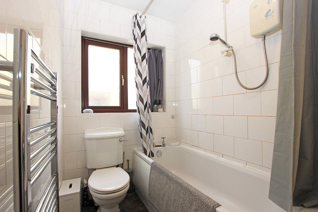 With a three piece white suite comprising a panelled bath having an independent shower over, pedestal hand wash basin, and a ow suite WC. Chrome heated ladder radiator. Full height neutral wall tiling. UPVC sealed unit double glazing incorporating privacy glass.