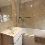 Well appointed with a modern white suite comprising low suite WC, hand wash basin set on a vanity cupboard and a panelled bath with chrome mixer shower over. Full quartz effect shower wall bording. UPVC sealed unit double glazing window. Chrome towel radiator.