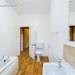 With a three piece white suite comprising a panelled bath having a tiled surround and a thermostatic shower together with a low suite WC and a pedestal wash basin including a tiled splash-back. Sash style UPVC sealed unit double glazing. Central heating radiator.
