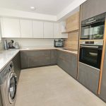 11’01 x 9’03 Superbly appointed contemporary range of two tone fitted wall and base units incorporating quartz worktop surfaces having matching upstands. Inset one and half bowl sink with drainer grooves into worktop surfaces. Built-in high-level Bosch electric oven. Built in Bosch microwave oven. Bosch five ring induction hob with extractor above. Integrated fridge and freezer. Plumbing for an automatic washing machine. Two UPVC sealed unit double glazed windows. Recessed ceiling spotlights.