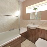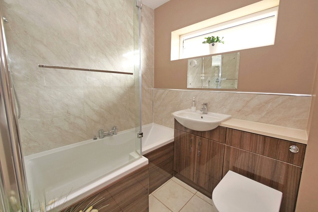 Superbly appointed three-piece white suite comprising low suite w/c and hand wash basin set into vanity cabinet. Fitted bath with thermostatic shower and glass shower screen. UPVC sealed unit double glazing with chrome central heating towel rail/radiator. Recessed ceiling spotlights. Extractor fan. Tiled flooring with electric underfloor heating. Built in airing cupboard housing hot water cylinder.
