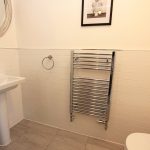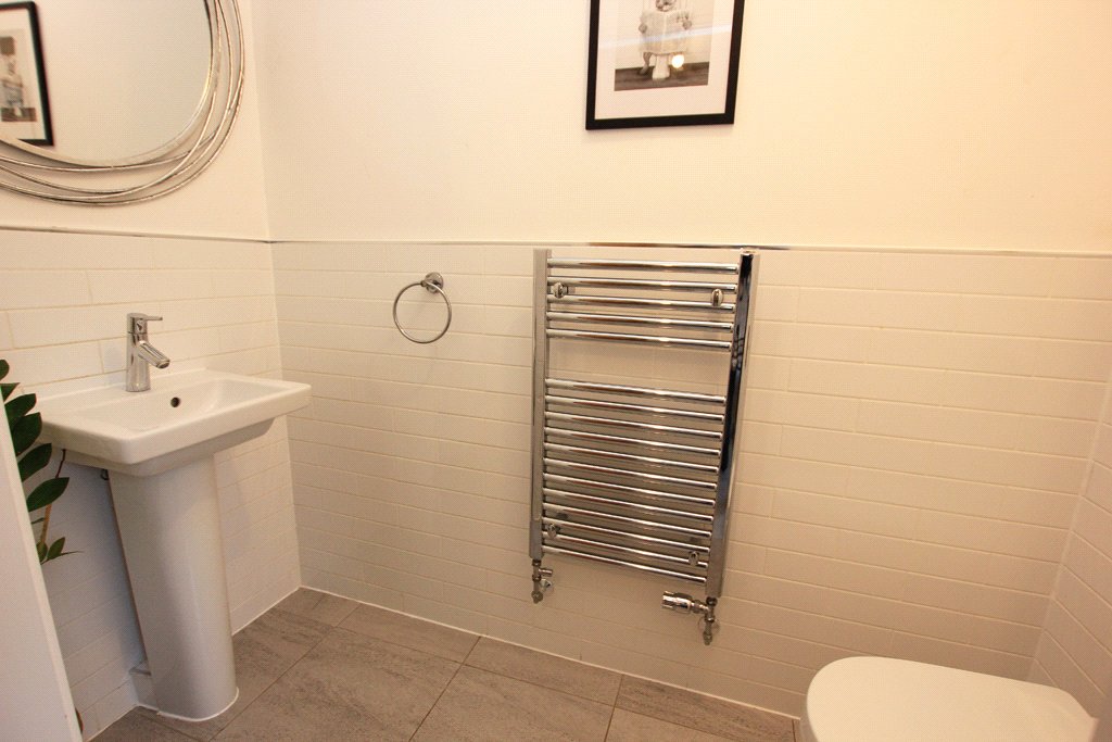 With a two piece white suite comprising low suite wc and a pedestal hand wash basin. Chrome ladder radiator. UPVC sealed unit double glazed window incorporating privacy glass. Neutral ceramic wall tiling. Ceramic floor tiles.