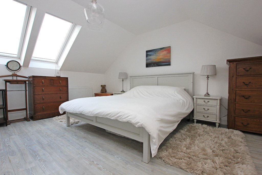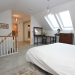Generously proportioned providing plenty of floorspace for a super-king sized bed. With two large velux windows. Two central heating radiators. Woodgrain effect laminated flooring. Dressing area with a range of built-in wardrobes on two sides. Access to: