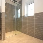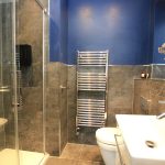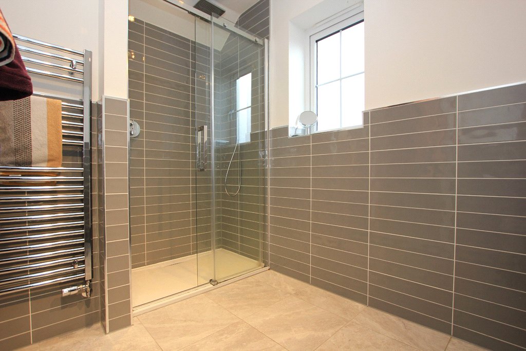 Contemporary three piece suite including low suite wc, hand wash basin set above a vanity cupboard, and shower enclosure equipped with two chrome showerheads. Recessed LED ceiling spotlights. LED mirror. Ceramic tiling. UPVC sealed unit double glazed window incorporating privacy glass.