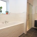 A tastefully appointed bathroom with low suite wc, a hand wash basin with cupboard underneath, a panelled bath, and a large shower enclosure. Neutral ceramic tiling. Luxury vinyl flooring. UPVC sealed unit double glazed window incorporating privacy glass.