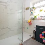 Well appointed with a contemporary three piece white suite comprising low suite WC, a hand wash basin having vanity drawer under, and a large walk-in shower enclosure equipped with chrome thermostatic shower. Veined ceramic wall tiling. Chrome towel radiator. UPVC sealed unit double glazed window incorporating privacy glass.