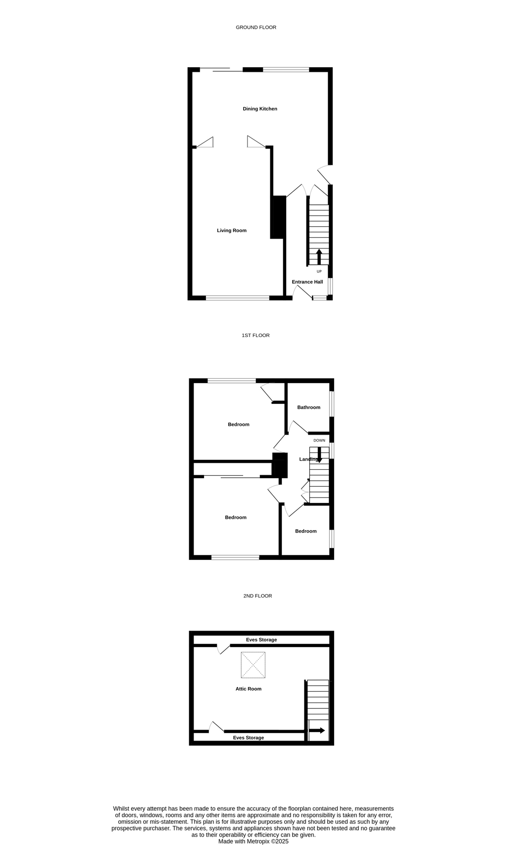 Traditional front entrance hall. A well proportioned living room with twin doors leading through to the spacious dining kitchen having patio doors leading out into the rear garden. The kitchen forms an L-shape with a further side entrance area and space for additional appliances. Downstairs WC underneath the staircase. The first floor includes a contemporary bathroom together with three well planned bedrooms with the front bedroom including fitted wardrobes whilst commanding superb open elevated views. From the landing a steep fixed ladder style staircase leads up to the useful attic space which is heated and decorated whilst also including a velux style window and, although it does not have building regulation approval for use as a bedroom, is suitable for a variety of uses such as a home office or snug.